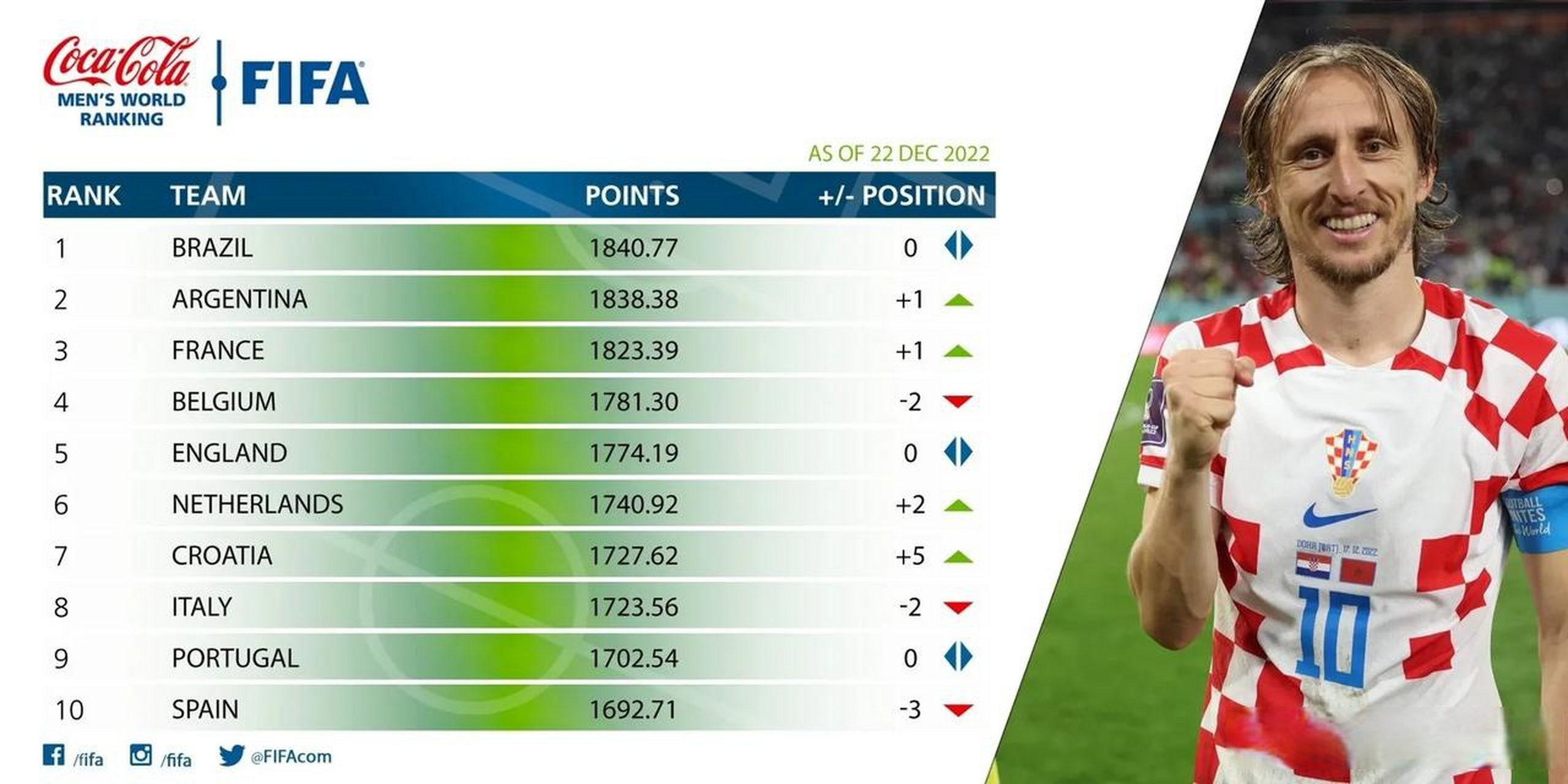 FIFA年终排名出炉:西班牙领跑,中国男足第93位创2014年后最差年终战绩